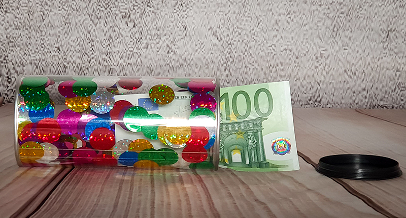 In die Dose passen Geldscheine, kleine Gutscheine, Süßigkeiten, Schmuck und andere kleine Aufmerksamkeiten.